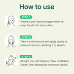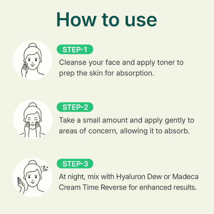 Take an appropriate amount and gently apply it to the areas of concern, allowing it to absorb into the skin. For enhanced care, you can frequently reapply the Madeca powder to the troubled areas. Alternatively, after using a toner, mix the Madeca Gel Serum with Hyaluron Dew and apply it evenly across your entire face for an increased synergy effect!